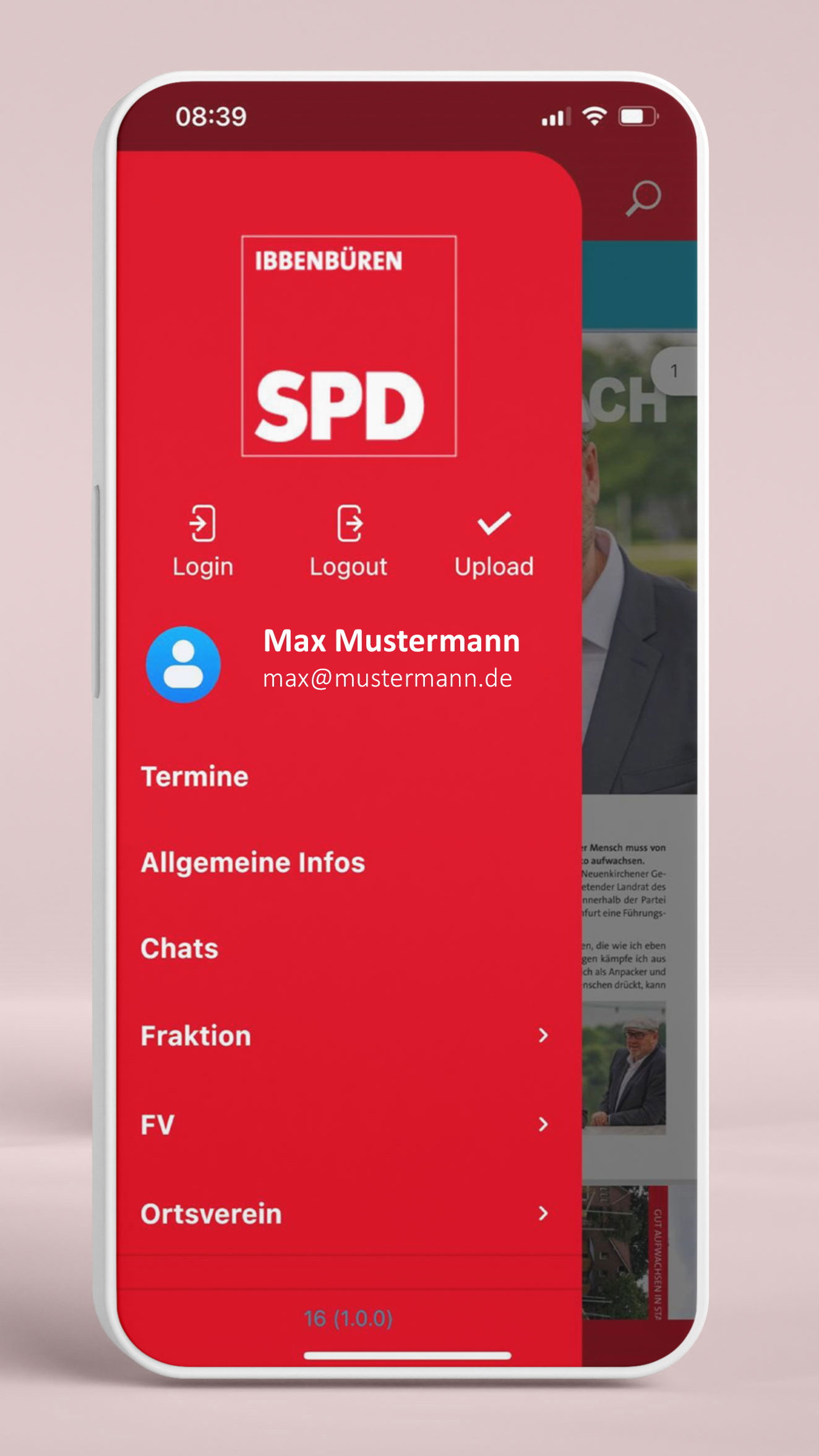 Links oben im roten Kopfbereich neben SPD Ibbenbüren siehst du das Hamburger Menü (3 Striche untereinander). Hiermit kannst du die Menüsteuerung ausklappen. Du kannst dich hier ein- und ausloggen und kommst zu deinem persönlichen Einstellungen/Profil. Je nach individuellem Zugriffsrecht siehst du außerdem den öffentlichen Bereich der Termine und der allgemeinen Infos, den eingeschränkten Bereich einzelner Arbeitsgruppen wie zum Beispiel der SPD Fraktion oder anderer Arbeitsgruppen. Außerdem findest du hier über das Menü Informationen zum Datenschutz in der App und den Blogbereich.
